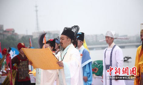 图为龙舟比赛前祭祀活动中主祭宣读祭文。中新社发 张浪 摄