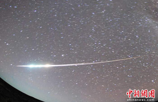 图为6月13日在澳大利亚南部伍默拉附近的沙漠地带用鱼眼镜头拍摄的日本“隼鸟”号探测器的密封舱下降的图片。