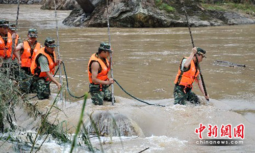 6月16日,福建南平武警官兵涉河搜寻失踪人员。14日,南平两辆汽车坠河事故发生后,当地政府全面展开搜救,紧急组织上千人,沿溪沿江进行全线搜救,全力查找失踪人员。中新社发 陈茂军 摄