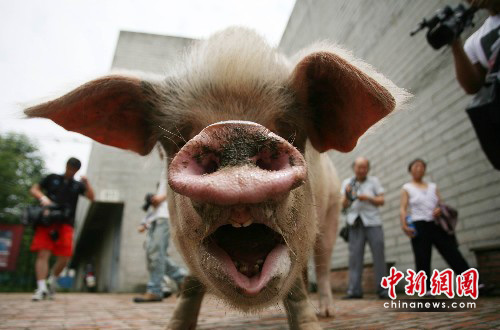 6月17日下午,在“5·12”地震后遭埋了36天获救的“猪坚强”迎来重生两周年。图为“猪坚强”唱生日歌庆重生两周年。中新社发 刘忠俊 摄