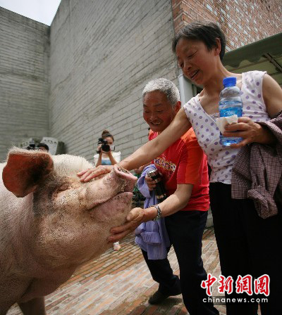 6月17日下午,在“5·12”地震后遭埋了36天获救的“猪坚强”迎来重生两周年。图为重生两周年万兴明夫妇赶来看望“猪坚强”。中新社发 刘忠俊 摄