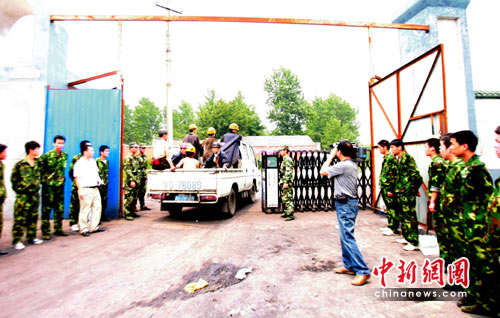 6月21日,河南平顶山发生爆炸事故的煤矿门口戒备森严。当日凌晨1时40分左右,平顶山市卫东区兴东二矿发生井下火药爆炸事故,当班共发放矿灯77盏,已确认入井72人,另有5人初步确定没有下井,正在进一步核查。截至10点整,现场经多次搜救,已生还26人,共发现46人遇难。中新社发 王中举 摄