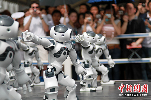 6月21日是上海世博会法国国家馆日,该馆在入口排队等候区安排了机器人表演,这是法国馆展示的机器人首次在展馆外表演“舞蹈”。中新社发 殷春永 摄