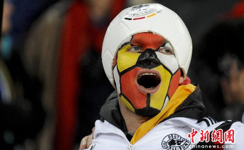 当地时间6月23日晚,以足球装扮脸面的德国球迷在约翰内斯堡足球城球场。当晚,世界杯小组赛D组德国对加纳的比赛在约翰内斯堡足球城球场举行。最终德国队1比0战胜加纳跻身16强。中新社发 廖攀 摄