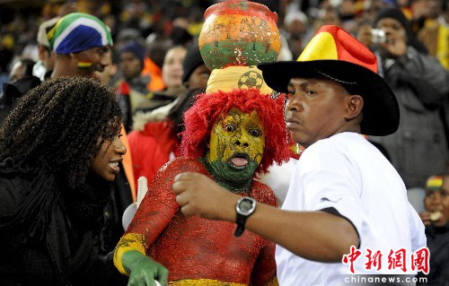 当地时间6月23日晚,头顶陶罐的加纳球迷在约翰内斯堡足球城球场。当晚,世界杯小组赛D组德国对加纳的比赛在约翰内斯堡足球城球场举行。最终德国队1比0战胜加纳跻身16强。中新社发 廖攀 摄