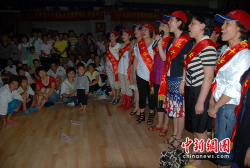 江西红十字会志愿者们为灾区群众唱歌,带去欢笑。作 者:刘占昆