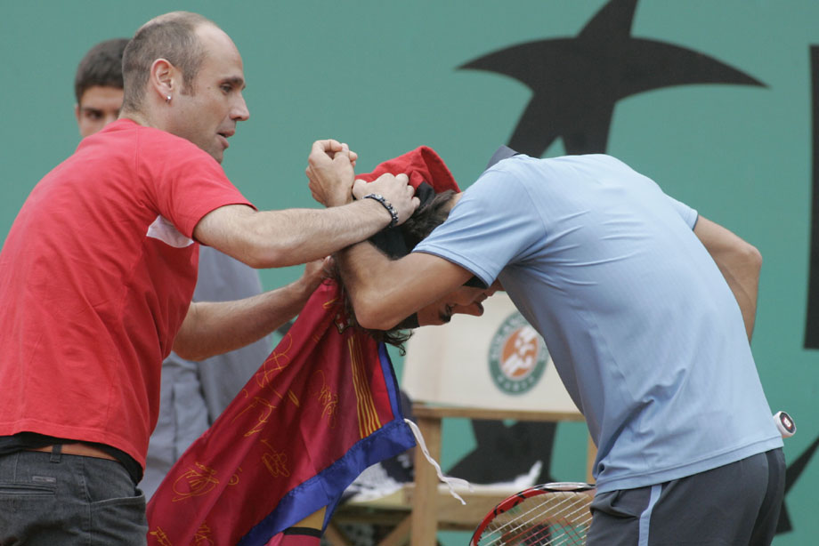 法网男单决赛场上,一位费天王的痴心球迷冲入球场,强行将自制的一顶帽子戴到费德勒的头上。安保人员及时出现,将狂热粉丝架出场外。