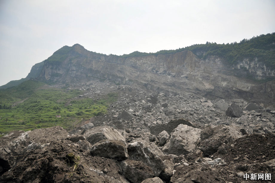600多米长的巨大滑坡体如洪流一般吞没了整个山谷。谷下,有着十几户家人居住,还有一个正在采矿的铁矿场。 曹多然 摄