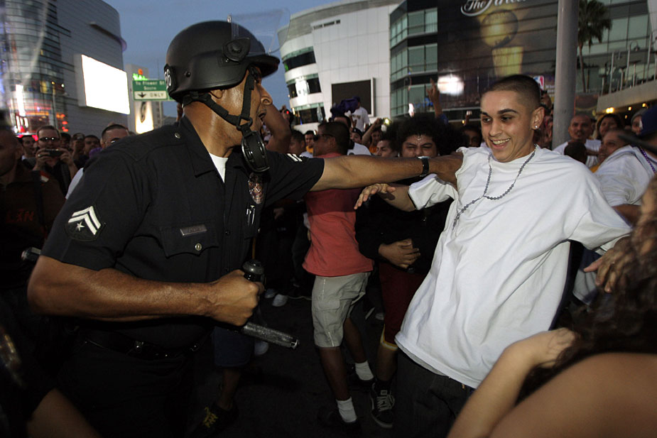 在洛杉矶湖人队15日夺得本年度NBA总冠军后,洛杉矶球迷涌上街头欢庆胜利,但在庆祝过程中偶发暴力事件,警方逮捕了至少8人。