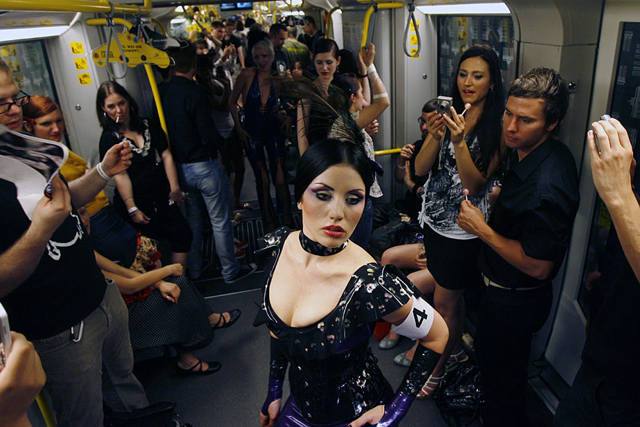 7月2日,模特在德国首都柏林的一辆地铁上,演绎名为“地铁上的猫步”时装秀。
