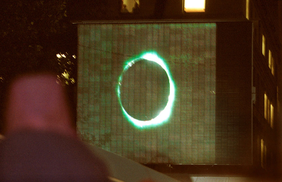 1999年8月11日,在德国斯图加特,人们在屏幕上看到日全食的天象。