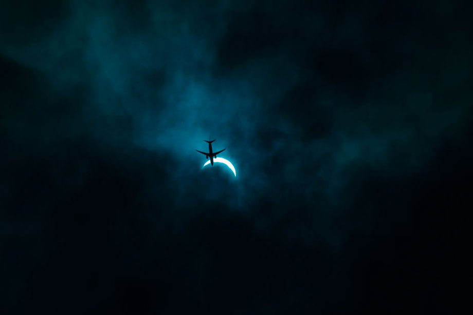 2009年7月22日上午9点20分左右,武汉出现日全食,恰逢客机穿越。dannier zheng/CFP