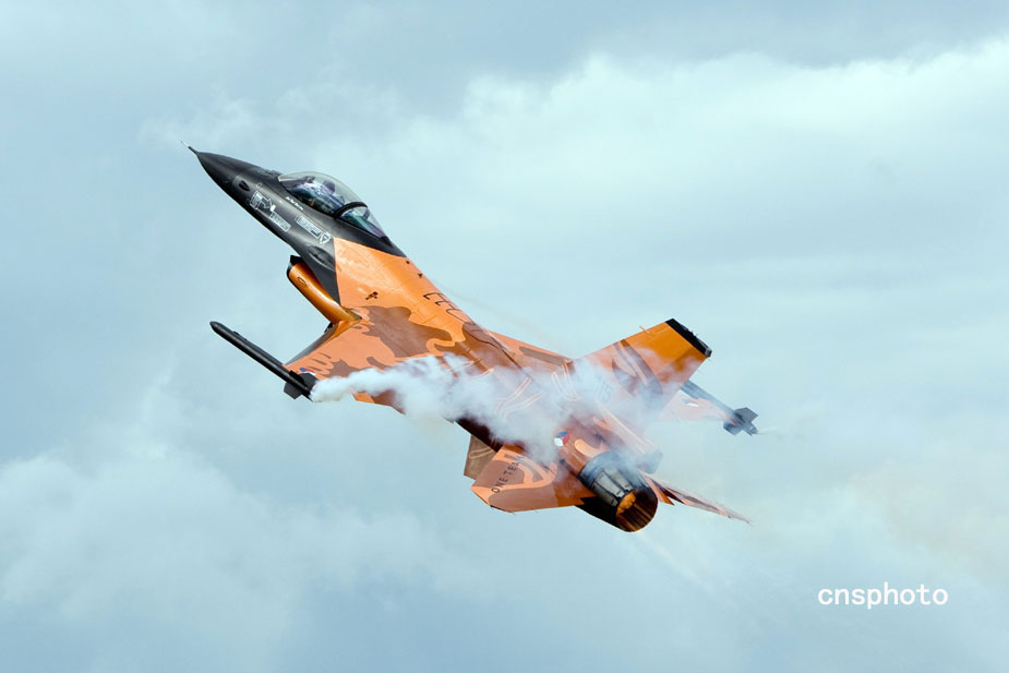2009年7月,“2009英国费尔福德航展”在英格兰费尔福德开展。图为荷兰皇家空军F-16战斗机,荷兰皇家空军此次以少见的橙色图装F-16战斗机在航展上亮相。中新社发 潘禹 摄