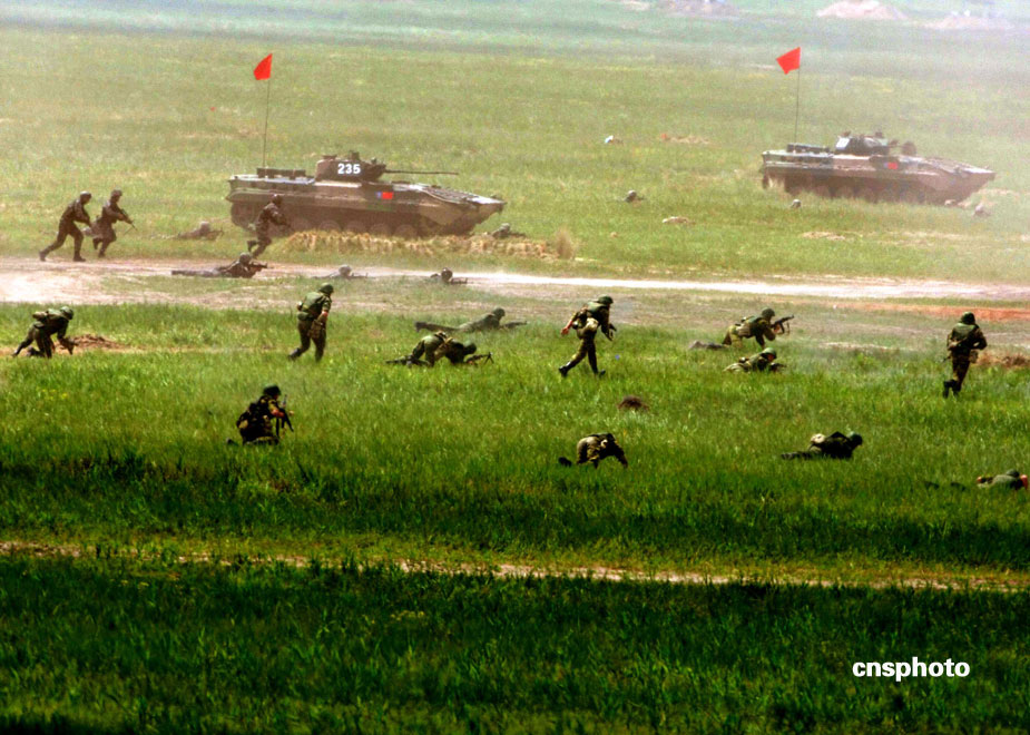中国、俄罗斯两军总参谋长,7月23日上午到沈阳军区洮南合同战术训练基地,观看“和平使命2009”联合反恐军事演习。双方以陆军和空军为主,中方参演部队包括1个陆军战斗群和1个空军战斗群。俄方参演兵力包括1个陆军加强摩步营、1个空降突击连和部分空军兵力,双方投入兵力两千多人。中新社发 宋吉河 摄
