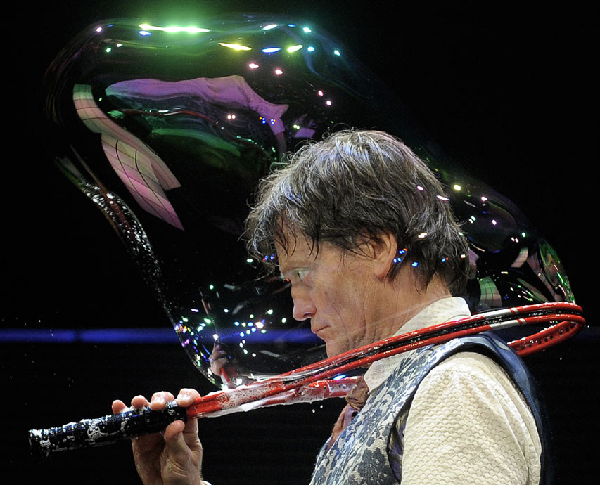 当地时间7月23日,西班牙国际肥皂泡艺术家皮蓬-玻尔在巴塞罗那进行肥皂泡艺术表演。