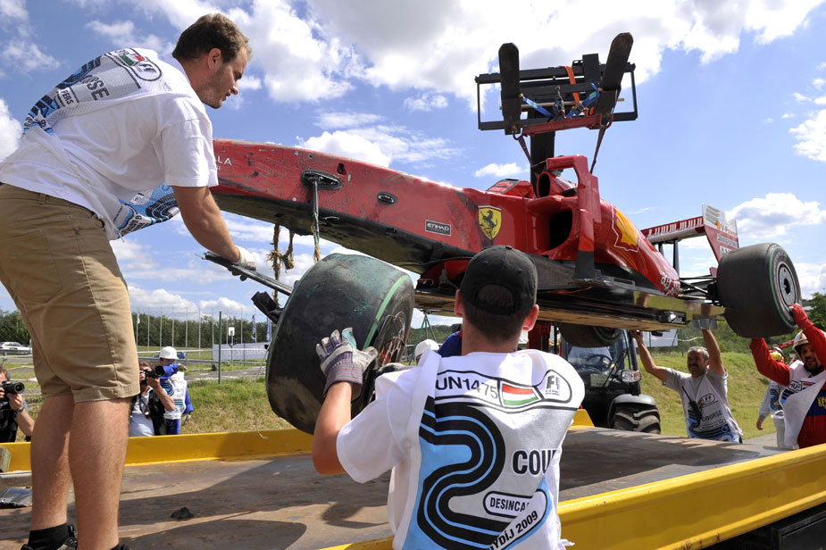 当地时间25日,F1大奖赛匈牙利站的排位赛在亨格罗林赛道举行。法拉利车队的巴西车手马萨的赛车在第二节冲出赛道并撞上轮胎墙。