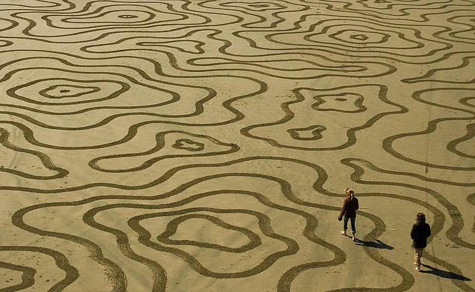 据英国媒体7月27日报道,艺术家Andres Amador用耙子在沙滩上作画,众多中心对称的几何图形,不在乎是否能长久保留,但求被海浪带走前与大自然的完美融合。