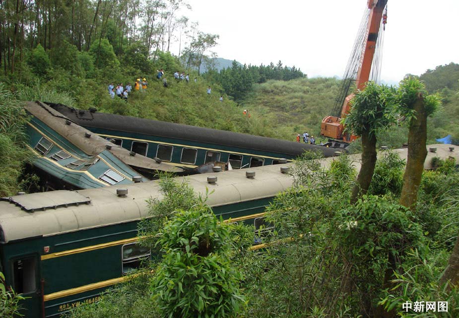2009年7月29日4时22分,由襄樊开往湛江的1473次旅客列车运行至焦柳线广西境内古砦至寨隆间,因连日持续强降雨造成山体崩塌掩埋线路,列车机车及机后1-4位车辆脱轨,造成4名旅客死亡,50余名旅客受伤,焦柳线中断行车。廖承果 摄