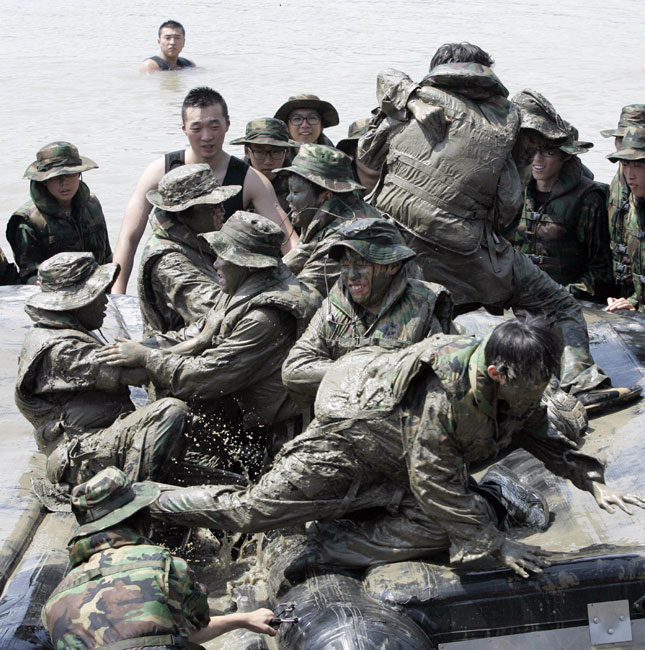 当地时间7月30日,在首尔的美军基地参加军训夏令营的韩国数百名学生来到金浦进行了泥地训练,场面十分激烈甚至残酷。