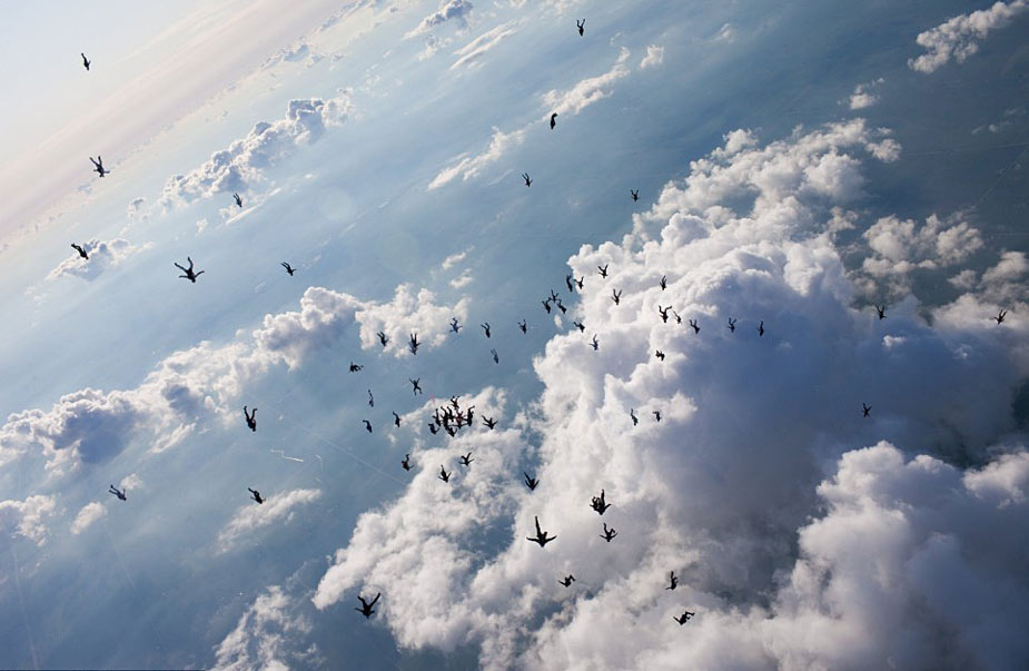 据英国媒体8月2日报道,美国上空108名伞降者从1.8万英尺(约5.48公里)高空以180英里每小时时速跳下,并在空中组成各种图形,欲打破世界纪录。
