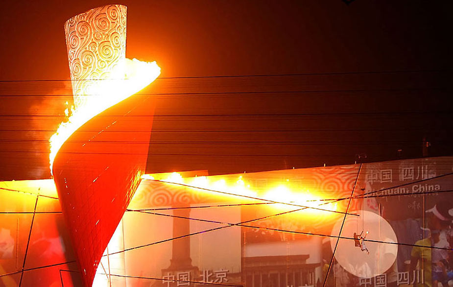 圣火点燃——主火炬点燃方式的“终极秘密”终于揭开,体操王子化身“空中飞人”,在空中绕鸟巢一周,踏着祥云长卷,奔向主火炬……,此意向神似中国古典神话“夸父逐日”。气势宏大,构思精巧,跳跃灵动的点火方式为08奥运开了个好彩头。