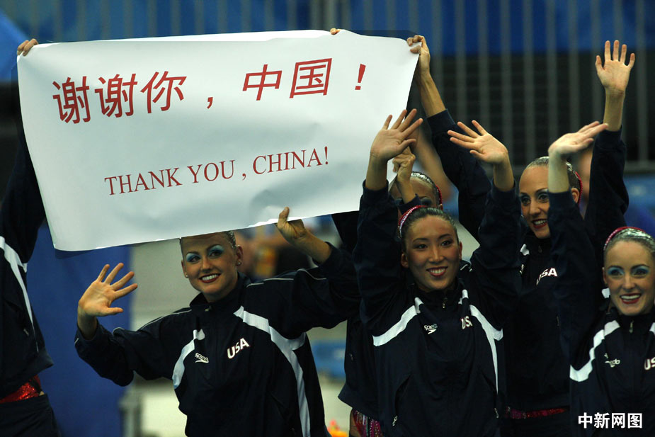 谢谢你中国——8月23日,美国花游队队员入场时,打出“谢谢你,中国”的条幅。