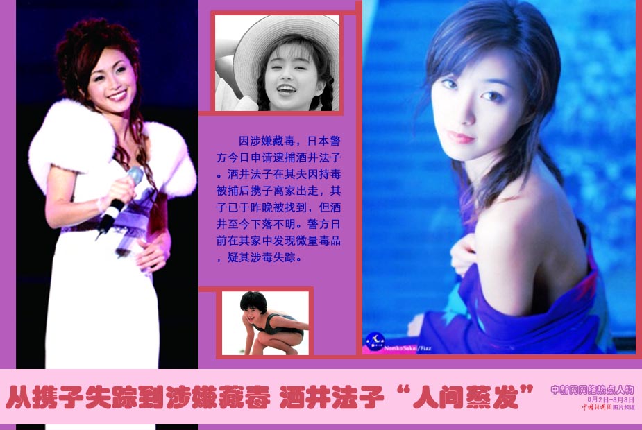 中新网本周热点人物之酒井法子——8月7日“日本新华侨报网”最新报道,东京都警视厅当日上午向检方申请批准逮捕状,要对至今仍然下落不明的女星酒井法子实施逮捕,其理由是涉嫌违反《兴奋剂取缔法》。酒井法子在8月3日爆出母子“失踪”,在8月6日又传出其长子在朋友家中平安无事,更引起警方怀疑。现在,警方将把搜寻下落不明的酒井法子改为追捕下落不明的酒井法子。