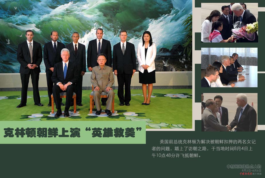 中新网本周热点人物之克林顿——8月6日,美国前总统克林顿在平壤斡旋成功,朝鲜领导人金正日下令特赦在押的两名美国女记者。三十二岁的凌志美、三十六岁的李承恩(前译李尤娜)与克林顿所乘坐的飞机在洛杉矶附近的伯班克机场降落,两名女记者下机时,与家人团聚激动得泣不成声。