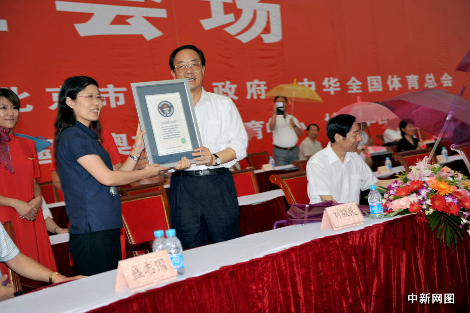 图为世界吉尼斯总部认证官将认证书颁发给北京市副市长刘敬民。
