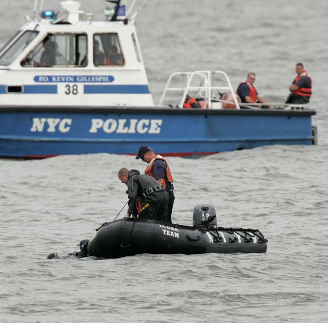 8月8日,纽约市曼哈顿西侧的哈德逊河上空,一架观光直升飞机和一架小型飞机相撞,两飞机双双坠入河中。据称观光直升飞机上载有五名意大利游客和一名飞行员,而小型飞机上则有三人。图为工作人员在现场救援。