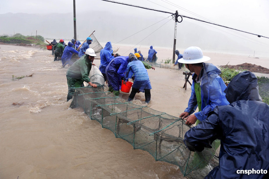 8月9日,福建省霞浦县牙城镇洪山村村民和武警官兵一起在洪水中抢收养殖的海鱼。中新社发 王东明 摄