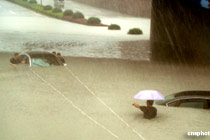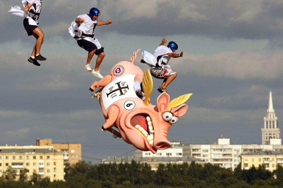 8月9日,莫斯科河畔举办一年一度的“坠落节”,表演者带着自己设计制作的各种“飞行器”勇敢的从高空跳入水中。