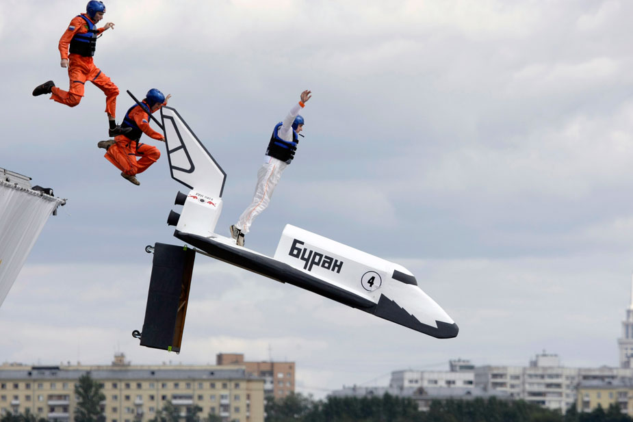 8月9日,莫斯科河畔举办一年一度的“坠落节”,表演者带着自己设计制作的各种“飞行器”勇敢的从高空跳入水中。
