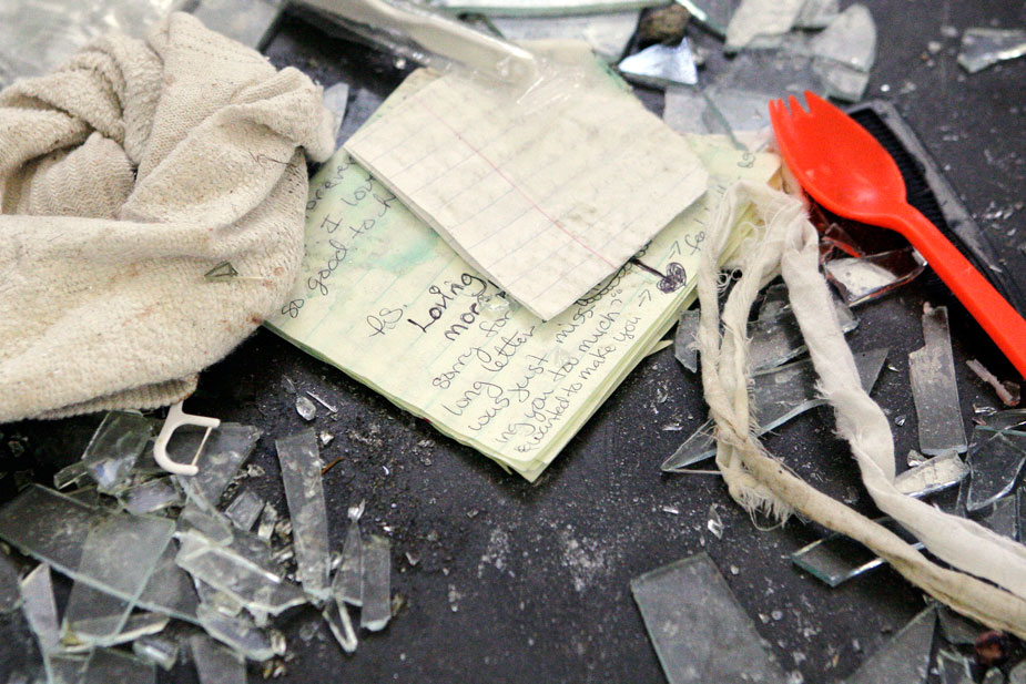 图为一名囚犯的信和地板上到处都是的碎玻璃。8月8日晚至9日凌晨,美国加州南部奇诺市发生大规模监狱骚乱,截至目前,在250多名受伤的在押犯人中,仍有16名犯人在医院接受治疗。