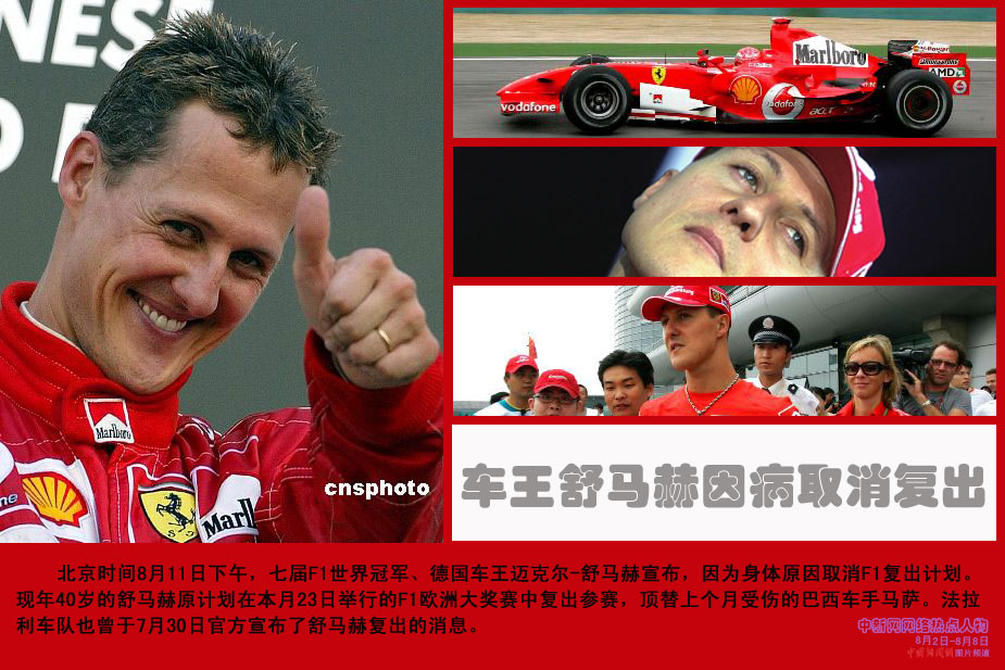 中新网本周热点人物之舒马赫——车王复出,本应是F1年度的最大新闻,最终却以闹剧的方式结尾。短短的13天时间,舒马赫带领全世界的车迷们上了天堂,又目送着他们的心情跌落到了地狱。