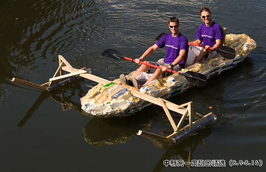 8月8日,来自新西兰的木匠Campbell Holm和他的伙伴划着一条由回收的塑料瓶制作的小船。点击观看详细内容