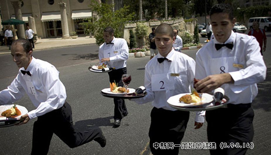 8月11日,大约30名以色列服务生端着盛有鸡肉、红酒的托盘参加在耶路撒冷举行的服务生赛跑。点击观看详细内容