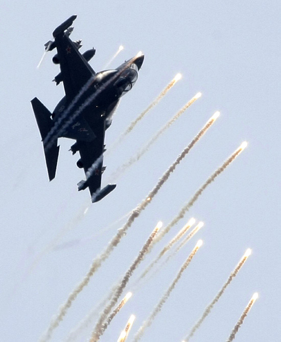 8月18日,2009莫斯科国际航空航天展(MAKS-2009)开幕。图为精彩的飞行表演。