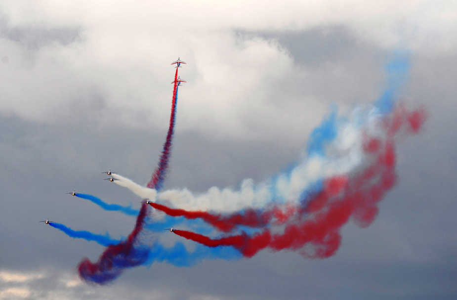 8月21日,在俄罗斯茹科夫斯基市举行的第九届国际航空航天展览会上,法国著名的“法兰西巡逻兵”飞行表演队进行了精彩的飞行表演。