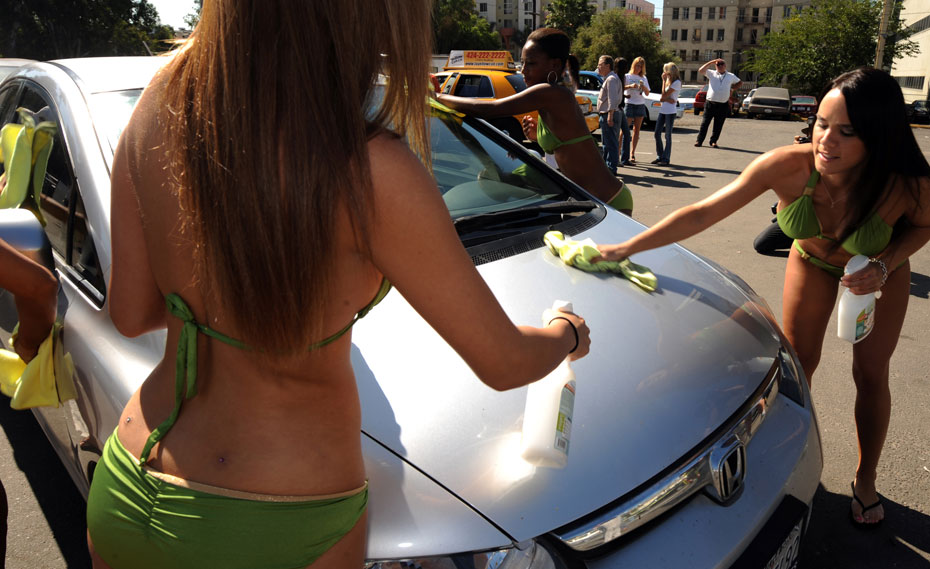 8月25日,一群身着绿色比基尼的模特在好莱坞前,为过往的混合动力环保车主免费擦车,呼吁环境保护。来源:中国新闻网