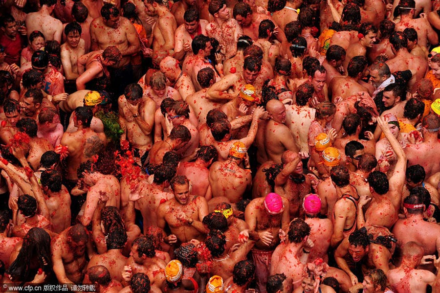 8月26日,西班牙东南部小镇Bunol当日迎来传统的西红柿节。大约4万名狂欢者在1小时内扔掉了11万公斤西红柿。来源:中国新闻网