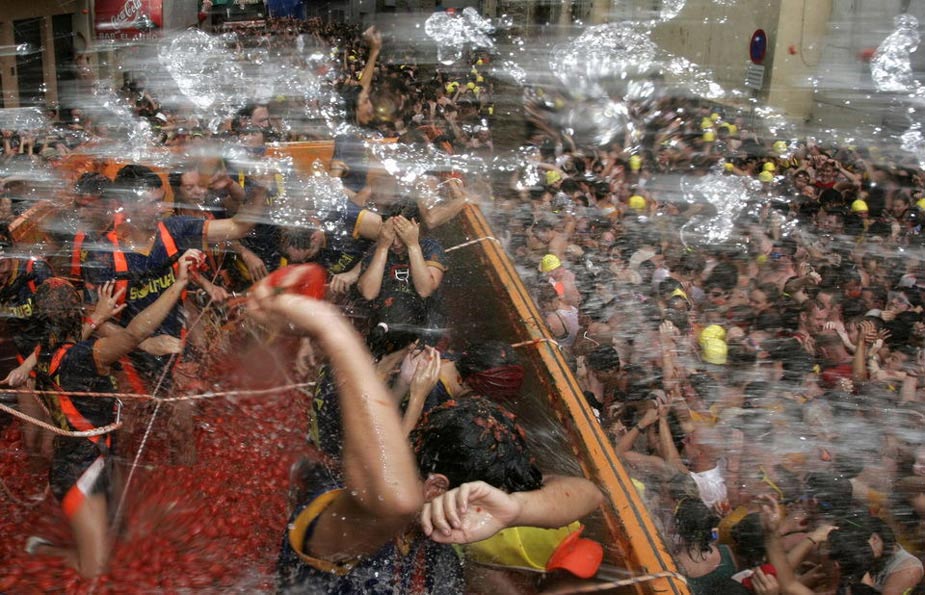 8月26日,西班牙东南部小镇Bunol当日迎来传统的西红柿节。大约4万名狂欢者在1小时内扔掉了11万公斤西红柿。来源:中国新闻网