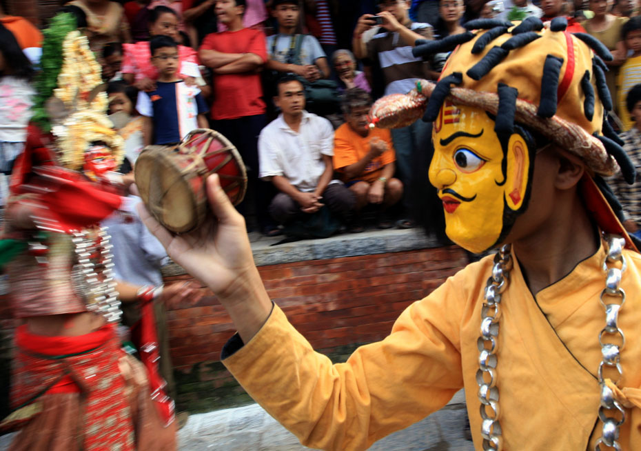 因陀罗节:在每年公历9月(尼历五月)举行的盛大节日。在印度教里,因陀罗被视为云雨之神;在佛教里,因陀罗又是护法之神。节日里,一般首先会举行竖立因陀罗旗杆(经过密宗仪式并修饰过的一棵树干)的仪式,活女神库玛丽(“活女神”库玛丽,也叫“处女神”,是女神在地面的代言人,代表纯洁、神圣和权力)将乘坐华贵的彩车出巡,人们会戴上传统的尼泊尔面具载歌载舞。热烈的节日一般持续八天,在第八天夜晚会举行放倒因陀罗旗杆的宗教仪式,众人将因陀罗旗杆抬到河边焚成灰烬,因陀罗节也同时宣告结束。