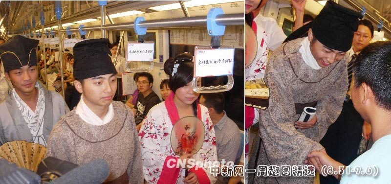 三日上午,三位身着古装的年轻人在南京地铁首列品牌列车“人文号”里,与乘客一起朗诵诗歌、知识竞答。图片来源:中国新闻网