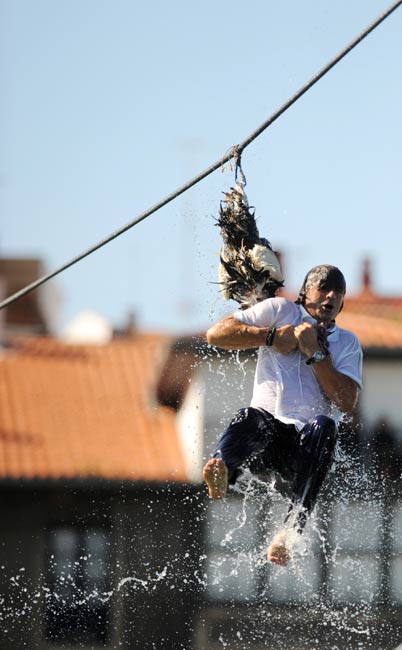 9月6日,西班牙巴斯克地区举行传统“鹅日”活动。人们用绳子将一些死鹅吊在空中,狂欢者跳起猛扯鹅头,看谁能取下。图片来源:中国新闻网