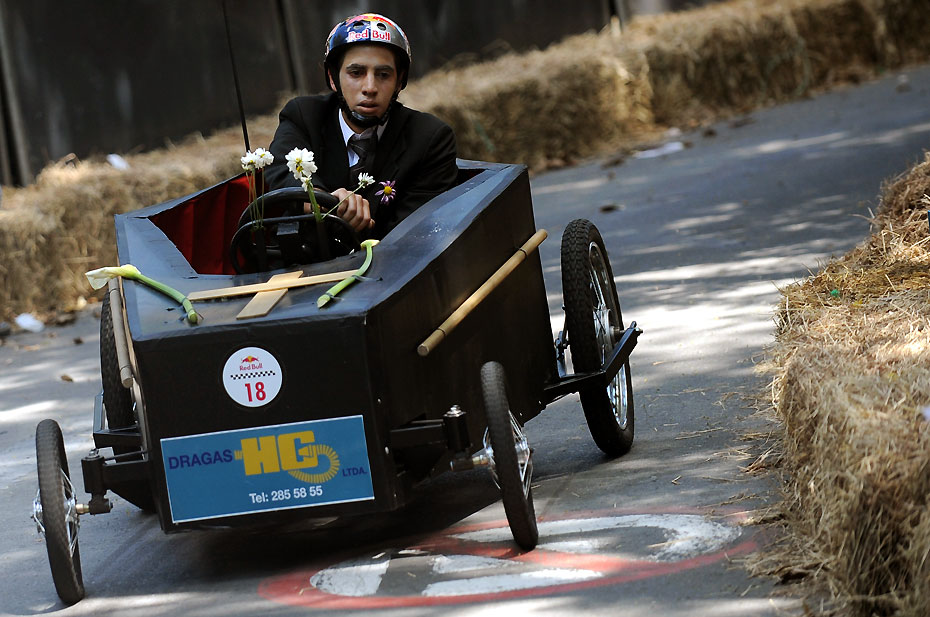 图为参赛选手带着自制的“棺材”赛车参加比赛。