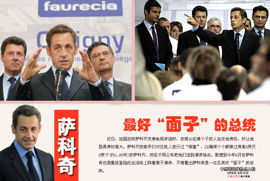 中新网本周热点人物之——萨科奇 近日,法国总统萨科齐发表电视讲话时,安排20名矮个子的人站在他身后,好让他显得身材高大。萨科齐的助手们对这批人进行过“审查”,以确保个个都矮过身高5英尺5英寸(约1.65米)的萨科齐,然后才用公车把他们送到演讲地点。联想到今年6月份萨科奇在诺曼底登陆纪念活动上踩着凳子演讲,不难看出萨科奇是一位及其好“面子”的总统。