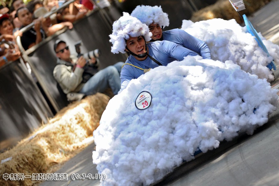 9月6日,哥伦比亚麦德林市举行了一场别开生面的小汽车竞赛,参赛选手带着各自设计的奇形怪状的“赛车”前来参加比赛。图片来源:中国新闻网