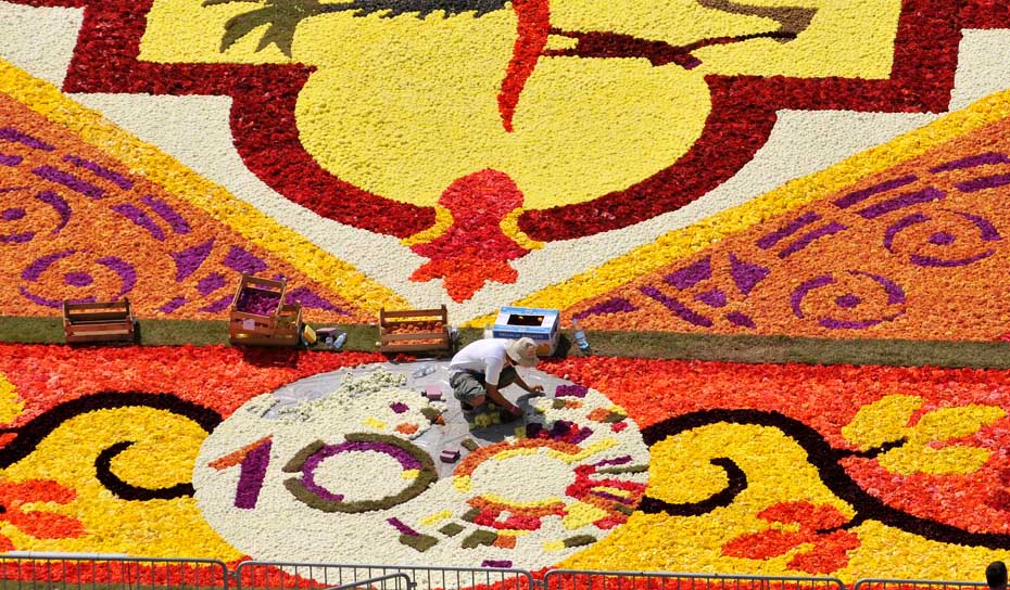 据悉,原本计划全部使用以色列的鲜花,但由于当地的鲜花产量不足,只能从布鲁塞尔进口,这批鲜花每朵花的直径都在20厘米左右。百名志愿者们费时7小时精心铺成了这张花毯,这张鲜花地毯将展示三天,随后将被生态埋葬。