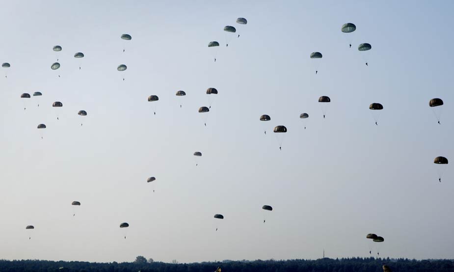 9月19日,英国空降兵在荷兰埃德附近进行伞降表演,纪念二战期间盟军最大规模的空降作战——“市场花园”行动65周年。
